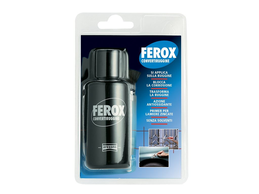 Prodotto per il trattamento della ruggine e per la protezione di tutte le superfici ferrose: arrugginite, nuove, verniciate e non. Pratico beccuccio dosatore. Pronto all’uso, facile e rapido da usare, resa elevata. Bassissima tossicità, Ferox è a base di resine sintetiche disperse in acqua e non contiene solventi: applicabile anche in ambienti chiusi o poco ventilati. Reagisce chimicamente con la ruggine, trasformandola in un complesso stabile, di colore nero, che una volta sovraverniciato resiste all’attacco degli agenti atmosferici ed è impermeabile all’umidità. Efficace anche su zone verniciate o su manufatti non arrugginiti, dove forma uno strato trasparente. Sovraverniciabile con qualsiasi tipo di vernice, all’acqua o al solvente. MODALITA’ D’USO: Eliminare eventuale ruggine a scaglie. Non applicare il prodotto a temperature inferiori a 5°C, o in eccessiva umidità. Versare la quantità necessaria di prodotto in un recipiente di plastica. Non riversare l’eventuale prodotto non utilizzato nel contenitore originale. Sovraverniciare le superfici trattate entro 24/36 ore dall’applicazione. SPECIFICHE DI UTILIZZO: Resa teorica a pennello 15-20 mq. Essiccazione a 20°C. Asciutto al tatto in 15’/30′. Intervallo di tempo fra le 2 mani: 15’/30′. Sovraverniciabile con lo smalto di finitura dopo 12 ore ed entro 24/26 ore dall’applicazione.
